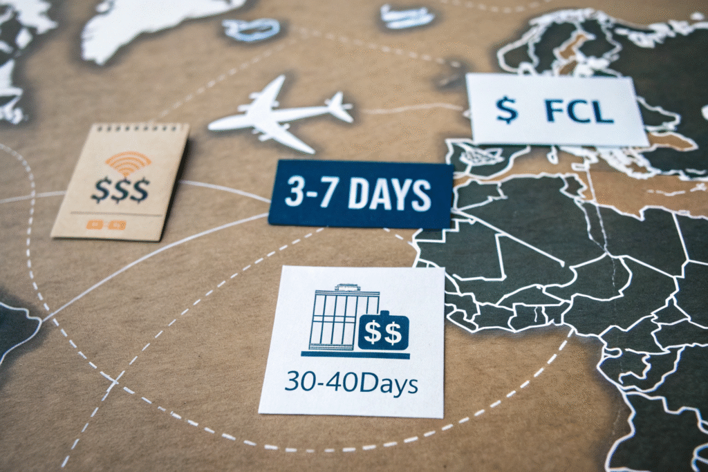 International shipping costs depend on weight, volume, and mode. The main options are air freight, LCL ocean, and FCL ocean. Each has different cost structures and transit times.