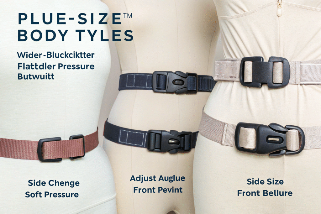 The buckle represents a critical fit point that can create uncomfortable pressure or dig into soft tissue. Standard buckle designs often fail to account for the greater abdominal curvature and softer tissue common in plus-size body types.