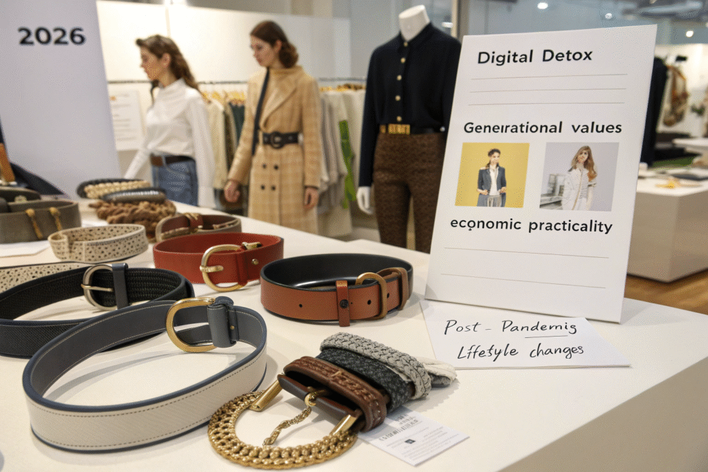 Key cultural influences for 2026 include digital detox movements, generational value shifts, economic practicality, and post-pandemic lifestyle changes. These macro-trends will shape consumer preferences for belt functionality, aesthetics, and symbolic meaning.
