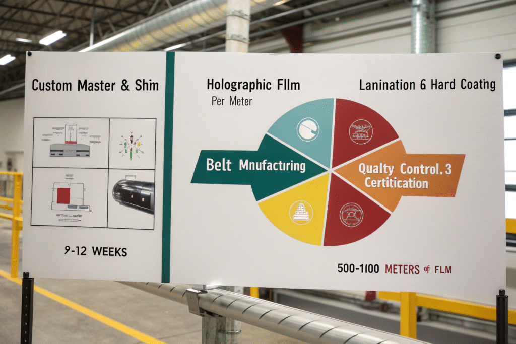 The cost structure is dominated by high NRE for the master shim, a substantial MOQ for the custom film (often 500-1000 linear meters), and a premium for hard-coat lamination. Lead times from design approval to finished belts typically range from 8 to 12 weeks, with the holographic film production being the longest pole.