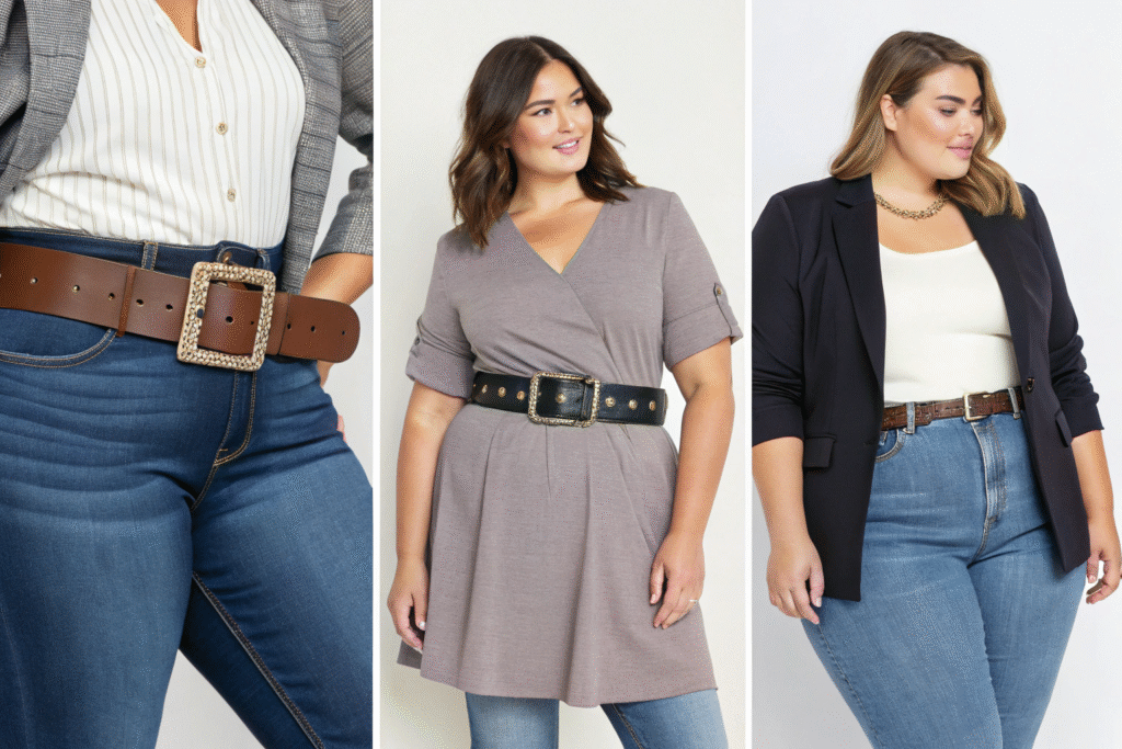 In plus-size fashion, belts serve as strategic styling tools rather than just functional accessories. Wider belts generally work better for creating defined waistlines and balancing broader shoulder and hip proportions. The scale of the belt must match the scale of the body and garment to achieve harmonious proportions.