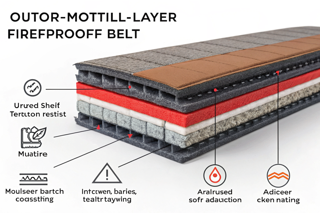 Multi-layer composites for fireproof belts integrate: a high-strength, abrasion-resistant outer shell (advanced aramid), a moisture barrier that also may be intumescent, a core thermal insulating layer (often featuring aerogels or phase-change materials), and an inner comfort layer of wicking, flame-resistant fabric. Smart coatings, such as intumescent or ceramic-based coatings, add active protective responses.
