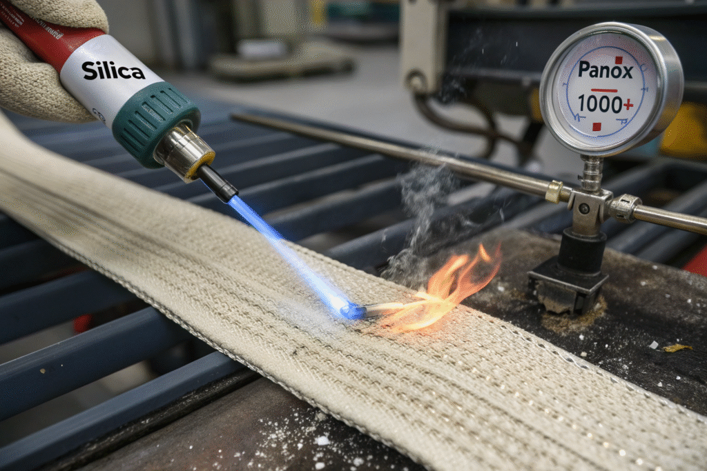 Silica-based fabrics (high-purity amorphous silica) and Pre-Oxidized PAN fibers (branded as PANOX, Pyron) offer near-incombustibility. Silica fabrics provide excellent thermal insulation and radiant heat reflection up to 1100°C, while pre-oxidized PAN fibers carbonize to form a strong, flexible char that resists further oxidation, operating continuously up to 250-300°C in air.