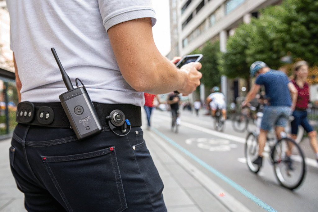 The waist is optimal because it is a stable, central point on the body with consistent proximity to the mouth for clear audio, and it allows for a larger battery and antenna than an earbud. Socially, speaking to your waist is less conspicuous and disruptive than talking into your wrist (which can appear rude) or having in-ear devices constantly plugged in. It also keeps the hands and wrist completely free for other tasks.