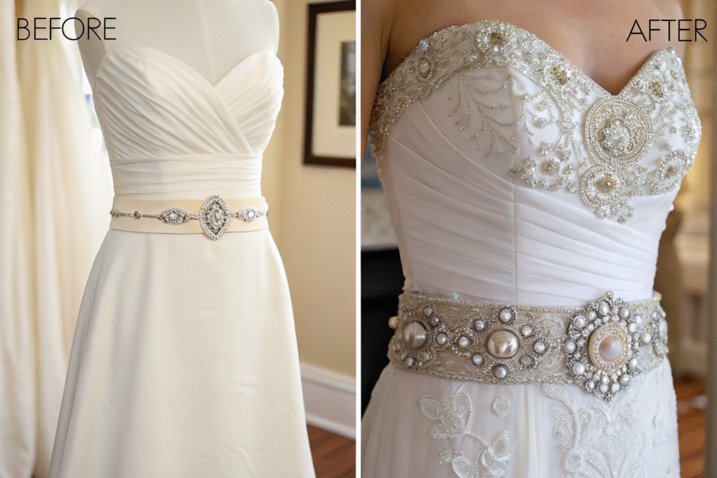 Embellished belts offer three primary silhouette benefits: waist definition, proportion balancing, and style transformation. A well-placed bridal belt can make a straight sheath dress appear more curvaceous, break up a large expanse of fabric on ballgowns, or create separation between bodice and skirt on mermaid styles. This definition is particularly valuable for wedding dress alterations where the original dress might not fit perfectly, as the belt can disguise minor fit issues while enhancing the overall silhouette.