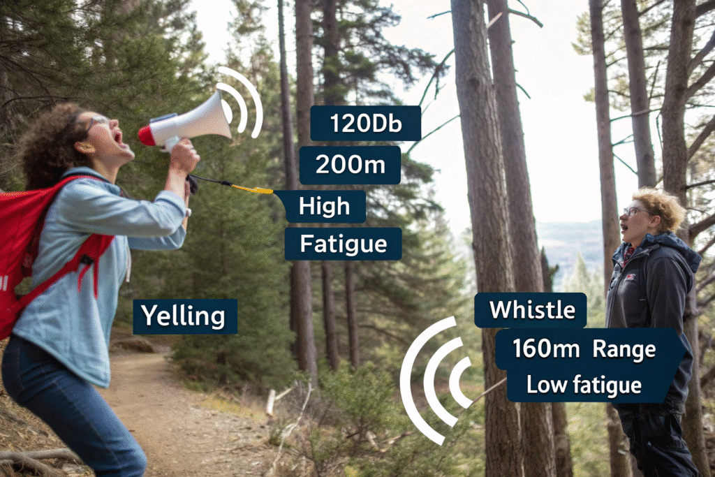 Yelling is exhausting. It consumes vital calories and hydration, strains the vocal cords, and can induce panic-induced hyperventilation. An injured or hypothermic person has limited energy reserves. Blowing a whistle uses minimal lung power—even a child or someone with diminished capacity can produce a loud, clear signal. The standardized international distress signal for a whistle is three sharp blasts (or three of anything: flashes, shouts). Repeating this pattern with a whistle is sustainable for hours, whereas yelling the same pattern would lead to rapid fatigue and voice loss.