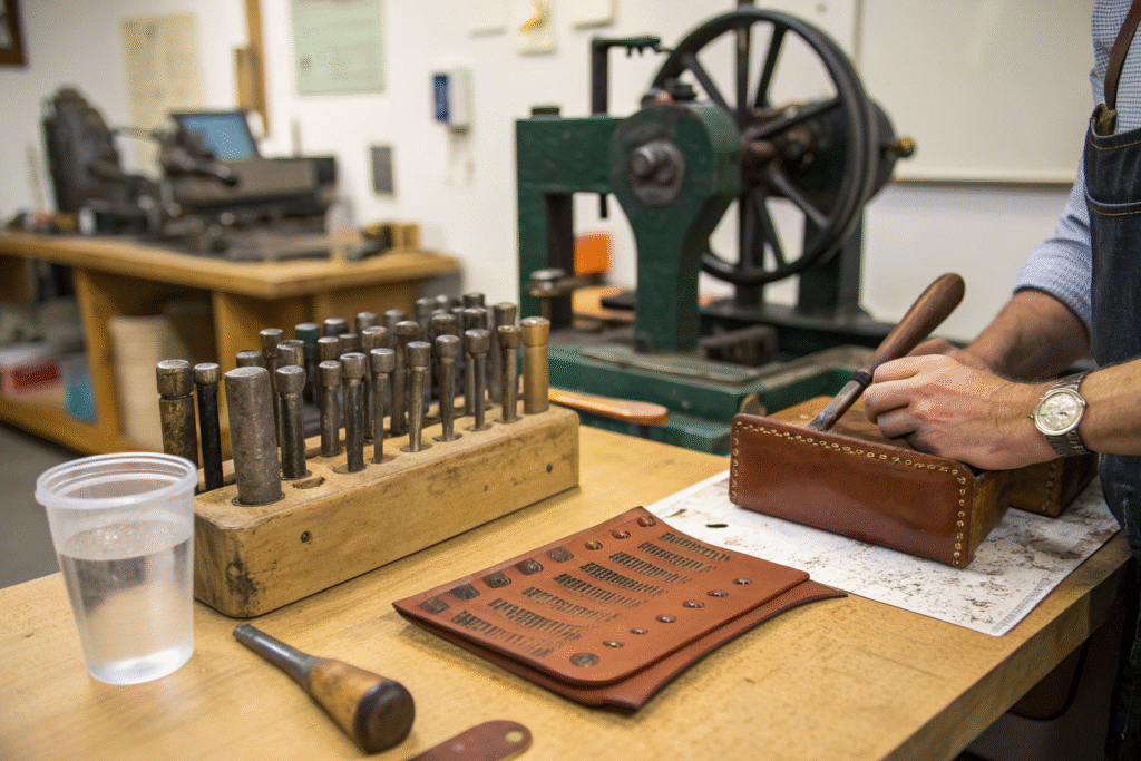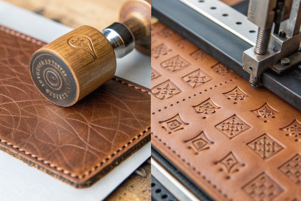 Heritage techniques include: Hand Stamping with Individual Steel Tools, where a craftsperson uses a mallet to strike individual stamping tools (each with a pattern like floral, geometric, or border) to build a design; Press Embossing with Antique Dies, where a hydraulic or manual press uses a large, intricately carved metal die (often from the early 20th century) to imprint a full pattern at once; and Carving and Tooling, which involves cutting into dampened leather with a swivel knife and then using beveling and background stamps to create a 3D, bas-relief effect. The results are inherently variable and bear the marks of human hands.